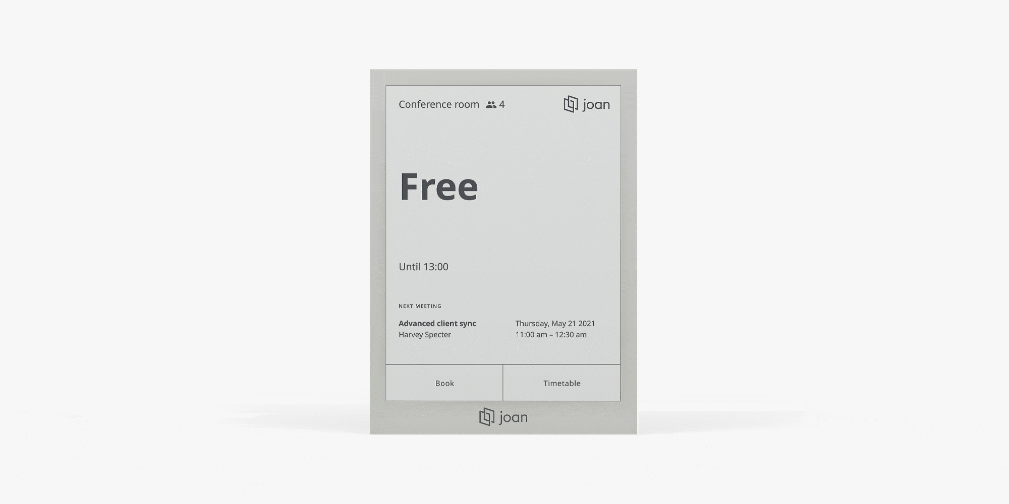 In addition to having low power consumption, Joan’s monochromatic ePaper display blends seamlessly with any workplace aesthetic. This maintains the ambiance of your office.